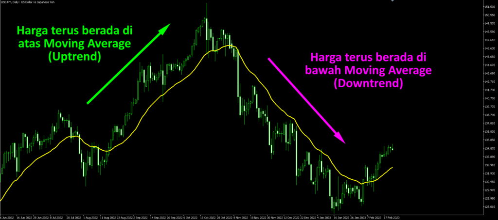 ii) Anda juga dapat menganalisis harga pasar berdasarkan posisi dan sudut Moving Average. Jika harga terus berada di atas Moving Average seperti yang ditunjukkan pada gambar di bawah, ini adalah tren naik. Jika harga terus berada di bawah Moving Average, itu bisa dinilai sebagai tren turun.