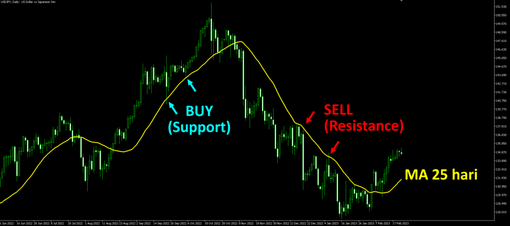 Moving average itu sendiri juga bisa berfungsi sebagai garis Resistance atau Support, yang memungkinkan kita membuat keputusan beli atau jual pada titik di mana harga menyentuh Moving Average.